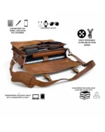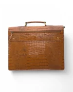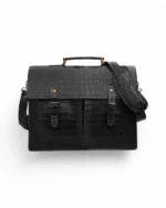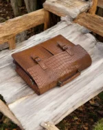 Crafted from 100% full-grain leather with an embossed alligator texture, this bag features premium Italian brass hardware for a sophisticated finish. The spacious main compartment includes a padded sleeve to secure a 16-inch laptop, along with multiple interior and exterior pockets for easy organization of documents, accessories, and essentials. A dedicated interior pocket keeps your phone safe, while built-in pen sleeves add convenience. The main compartment is secured with hidden slide clasps beneath elegant buckle straps, giving it a timeless, vintage appeal.