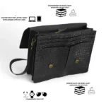 Practicality is included, as this design snugly fits your 15″ laptop, features large secure front zipper pocket, pen holders, multiple sized pockets and easy opening with brass tuck lock.